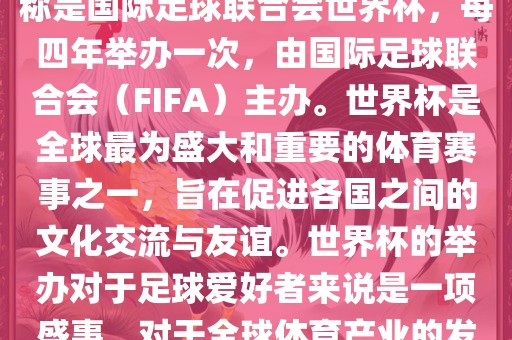 世界杯是国际足球联合会主办的一项国际足球赛事,每四年举办一次。作为全球最盛大的体育赛事之一,世界杯旨在促进各国之间的文化交流与友谊。对于足球爱好者和全球体育产业来说,世界杯的举办具有重要影响,吸引了全球无数观众和球迷的关注。