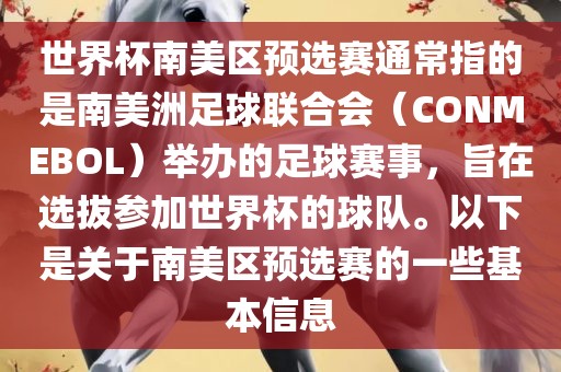 世界杯南美区预选赛通常指的是南美洲足球联合会(CONMEBOL)举办的足球赛事,旨在选拔参加世界杯的球队。以下是关于南美区预选赛的一些基本信息