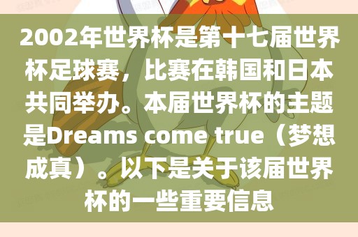 摘要:2002年世界杯足球赛是第十七届比赛,在韩国和日本共同举办,主题为Dreams come true。该届世界杯见证了众多精彩比赛和难忘的瞬间,同时也留下了许多重要信息,成为世界杯历史上的一个重要篇章。
