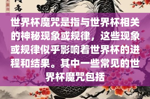 世界杯魔咒是指与世界杯相关的神秘现象或规律,这些现象或规律似乎影响着世界杯的进程和结果。其中一些常见的世界杯魔咒包括