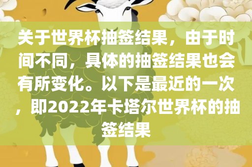 关于世界杯抽签结果,由于时间不同,具体的抽签结果也会有所变化。以下是最近的一次,即2022年卡塔尔世界杯的抽签结果