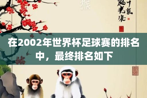 在2002年世界杯足球赛中,经过激烈的角逐,最终排名已经确定。各国队伍为了荣誉和胜利奋力拼搏,展现出精湛的球技和团队合作精神。经过层层选拔和比拼,最终排名揭晓,各国队伍的名次各有千秋。这场比赛不仅展现了足球运动员的才华和技艺,也展现了足球运动的魅力和激情。