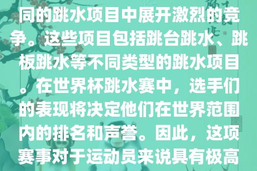 世界杯跳水赛是跳水运动的最高级别赛事之一,通常与世界跳水锦标赛等重大赛事交替举办。这项赛事汇集了全球最优秀的跳水运动员,他们将在不同的跳水项目中展开激烈的竞争。这些项目包括跳台跳水、跳板跳水等不同类型的跳水项目。在世界杯跳水赛中,选手们的表现将决定他们在世界范围内的排名和声誉。因此,这项赛事对于运动员来说具有极高的挑战性和重要性。同时,世界杯跳水赛也是展示各国跳水运动水平的重要舞台,对于推动全球跳水运动的发展起到了积极的作用。