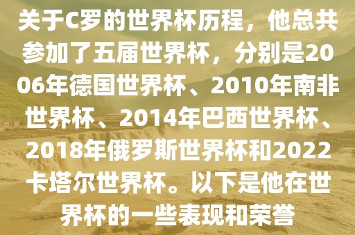 关于C罗的世界杯历程,他总共参加了五届世界杯,分别是2006年德国世界杯、2010年南非世界杯、2014年巴西世界杯、2018年俄罗斯世界杯和2022卡塔尔世界杯。以下是他在世界杯的一些表现和荣誉
