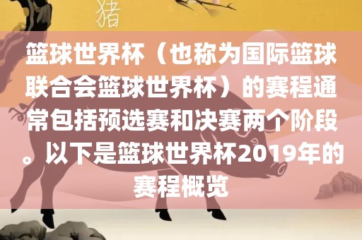 篮球世界杯(也称为国际篮球联合会篮球世界杯)的赛程通常包括预选赛和决赛两个阶段。以下是篮球世界杯2019年的赛程概览