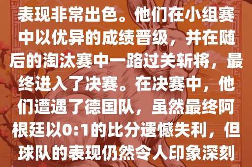 在2014年世界杯中,阿根廷表现出色,小组赛顺利晋级,并在淘汰赛中展现强大的实力,最终进入决赛。面对德国队,虽然以0:1的比分失利,但球队表现令人印象深刻。