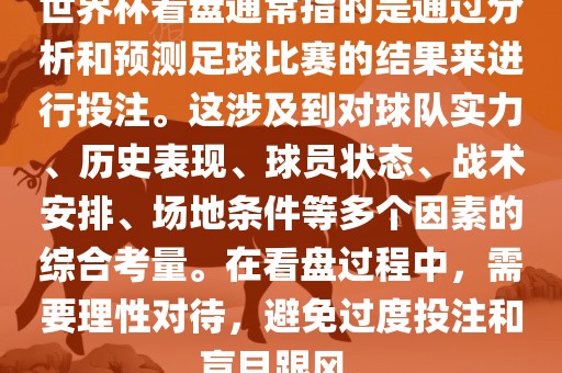 摘要:世界杯看盘是通过分析足球比赛的多个因素来进行投注的一种方式。这包括研究球队实力、历史表现、球员状态和战术安排等。在看盘过程中应保持理性,避免盲目跟风或过度投注,做出明智的决策。