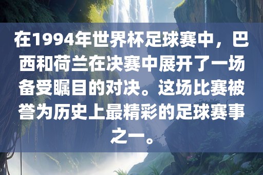 在1994年世界杯足球赛中,巴西和荷兰在决赛中展开了一场备受瞩目的对决。这场比赛被誉为历史上最精彩的足球赛事之一。