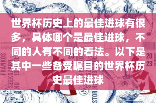 关于世界杯历史最佳进球,众说纷纭。以下是备受瞩目的几个进球简介:,,在世界杯的历史长河中,众多精彩进球留下了难以磨灭的印象。每个球迷心中都有自己心目中的最佳进球,而一些标志性进球如阿根廷球星迭戈·马拉多纳的“世纪进球”、英格兰球员加里·莱因克尔的远距离射门等,都成为了世界杯历史上的经典瞬间。这些进球以其独特的方式和震撼力,被永远铭记在足球史册中。