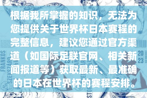 摘要:本文简要提及作者无法提供关于世界杯日本赛程的完整信息,并建议读者通过官方渠道获取最新、最准确的日本在世界杯的赛程安排。